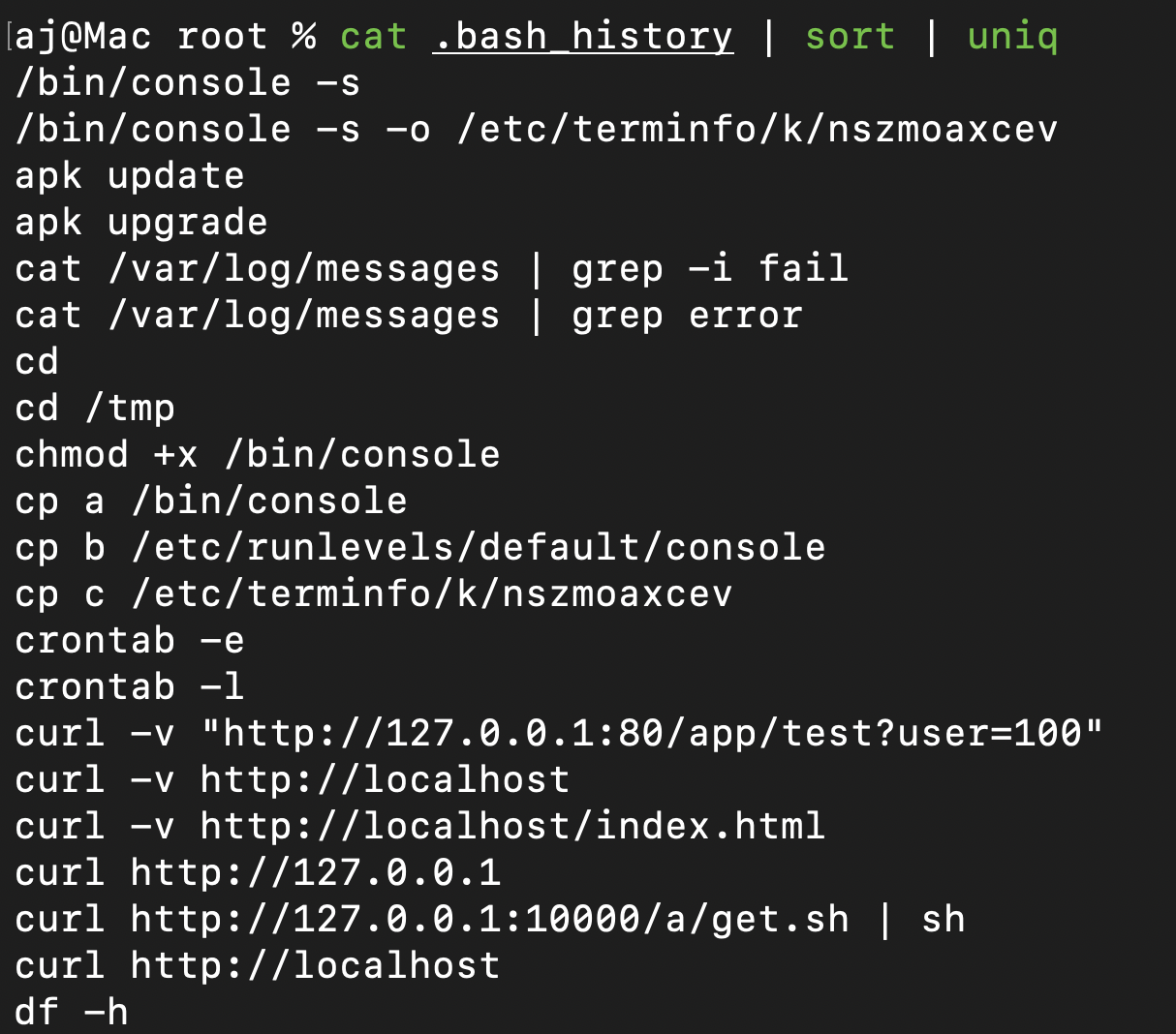 Reading this file is difficult because it has 8,000 lines (we can verify with wc -l .bash_history). One thing I notice is that there are many repeated strings in the output. A quick method to eliminate duplicates and organize entries is to use sort and uniq, which sort lines alphabetically and display only unique items. This reduces the search window from 8,000 to 93 lines.